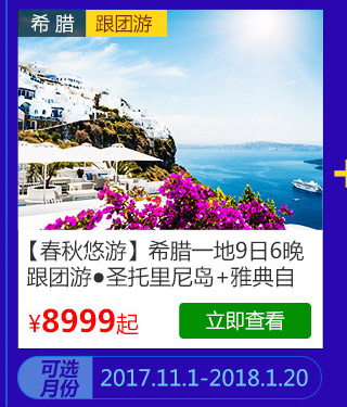 D套餐:9999元享受价值11498元“希腊一地9日6晚惠游”与“曼谷7日跟团游”。