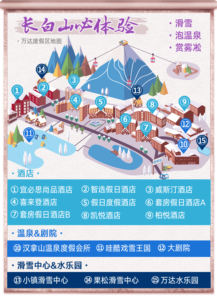 【假日度假酒店】酒店前往度假小镇中心及商业街十分方便,可以前往小镇中心办理雪卡、领取装备。